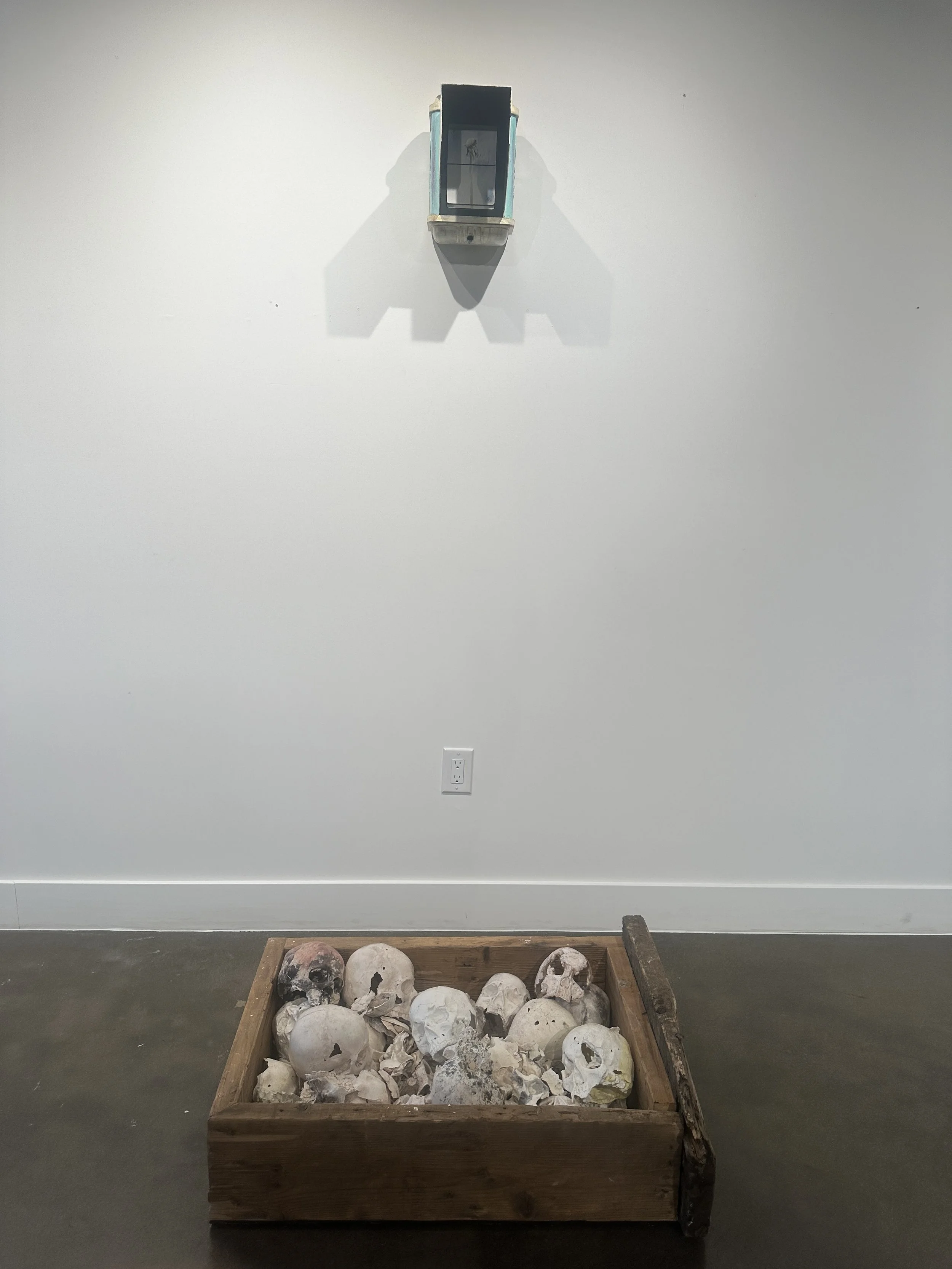 To look ahead, the viewer must first crush what remains of the past. The plaster skulls underfoot break with each step, their sound echoing the quiet violence of progress. Above, within a worn, two-toned hooded mechanism, eight small watercolours revolve, a mechanical meditation on the life of a dandelion, from bloom to drift to disappearance.